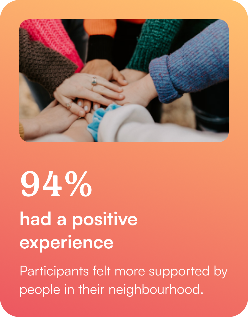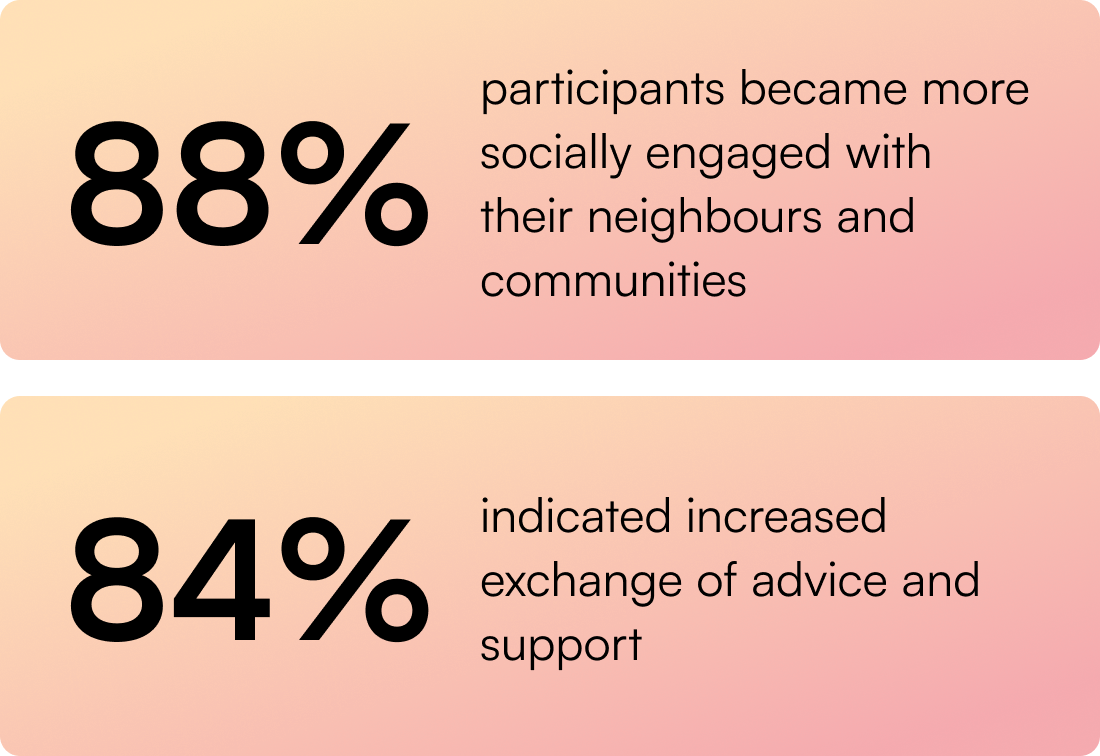 Many reported feeling more connected to those around them, with Friendzone providing a space to foster meaningful and lasting relationships. These results demonstrate real progress in helping people feel more supported and integrated within their neighbourhood community.
